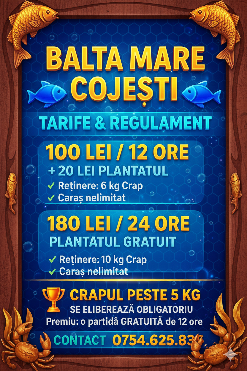 Balta Mare Cojesti este o Balta Semisalbatica , putem spune ca este cea mai mare balta din zona , cu o suprafata de peste 20 de hectare cu zone de stuf si vegetatie salbatica . Daca doriti sa va relaxati si sa prindeti si peste va asteptam pe Balta Mare Cojesti , locul perfect pentru pescuit .Balta Mare Cojesti detine foarte mult caras (mananca si la undita )crap , biban , salau si alte specii . Va asteptam cu Drag la pescuit si va uram " Fir Intins "